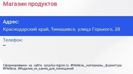 Магазин продуктов по адресу Краснодарский край, Тимашевск, улица Горького, 28 в дальнейшем Организация, размещена в следующих категориях: