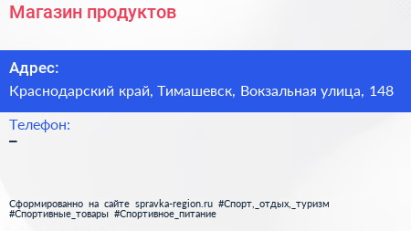 Магазин продуктов по адресу Краснодарский край, Тимашевск, Вокзальная улица, 148 в дальнейшем Организация, размещена в следующих категориях: