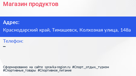 Магазин продуктов по адресу Краснодарский край, Тимашевск, Колхозная улица, 148а в дальнейшем Организация, размещена в следующих категориях: