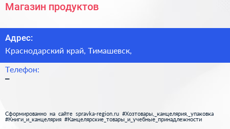 Магазин продуктов по адресу Краснодарский край, Тимашевск, в дальнейшем Организация, размещена в следующих категориях: