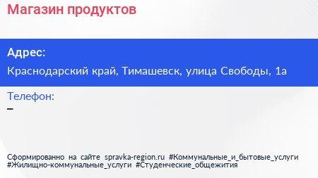 Магазин продуктов по адресу Краснодарский край, Тимашевск, улица Свободы, 1а в дальнейшем Организация, размещена в следующих категориях: