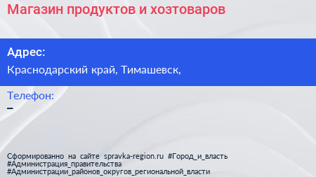 Магазин продуктов и хозтоваров по адресу Краснодарский край, Тимашевск, в дальнейшем Организация, размещена в следующих категориях: