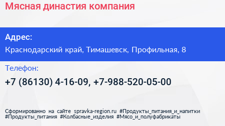 Мясная династия, компания по адресу Краснодарский край, Тимашевск, Профильная, 8 в дальнейшем Организация, размещена в следующих категориях: