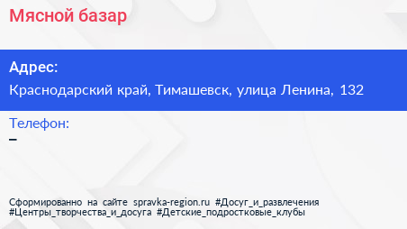 Мясной базар по адресу Краснодарский край, Тимашевск, улица Ленина, 132 в дальнейшем Организация, размещена в следующих категориях: