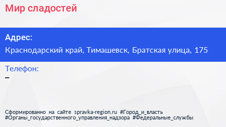 Мир сладостей по адресу Краснодарский край, Тимашевск, Братская улица, 175 в дальнейшем Организация, размещена в следующих категориях: