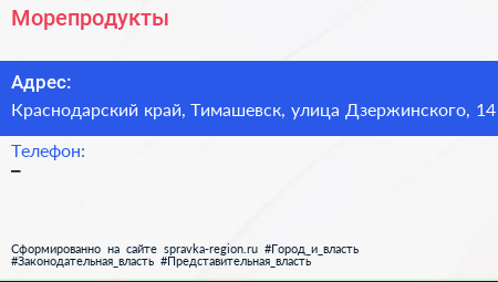 Морепродукты по адресу Краснодарский край, Тимашевск, улица Дзержинского, 14 в дальнейшем Организация, размещена в следующих категориях: