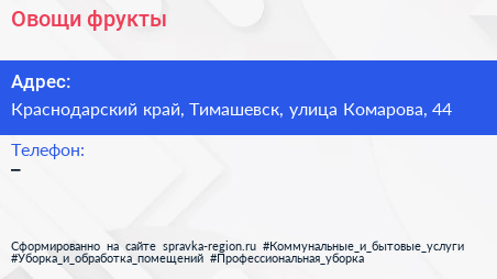 Овощи фрукты по адресу Краснодарский край, Тимашевск, улица Комарова, 44 в дальнейшем Организация, размещена в следующих категориях: