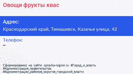 Овощи, фрукты, квас по адресу Краснодарский край, Тимашевск, Казачья улица, 42 в дальнейшем Организация, размещена в следующих категориях: