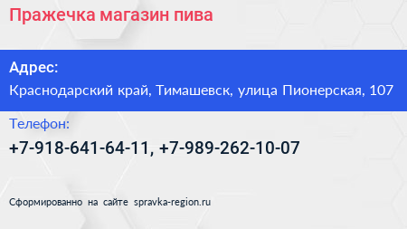 Пражечка, магазин пива по адресу Краснодарский край, Тимашевск, улица Пионерская, 107 в дальнейшем Организация, размещена в следующих категориях: