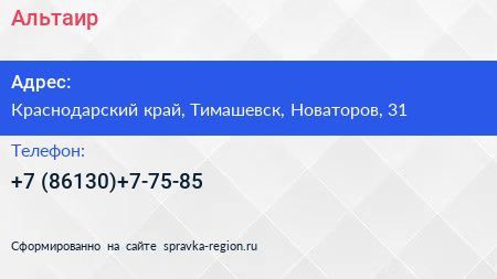 Альтаир по адресу Краснодарский край, Тимашевск, Новаторов, 31 в дальнейшем Организация, размещена в следующих категориях: