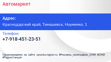 Автомаркет по адресу Краснодарский край, Тимашевск, Науменко, 1 в дальнейшем Организация, размещена в следующих категориях: