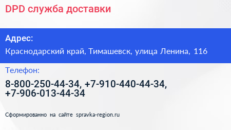 DPD, служба доставки по адресу Краснодарский край, Тимашевск, улица Ленина, 116 в дальнейшем Организация, размещена в следующих категориях: