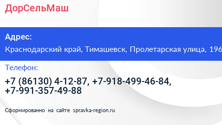 ДорСельМаш по адресу Краснодарский край, Тимашевск, Пролетарская улица, 196 в дальнейшем Организация, размещена в следующих категориях: