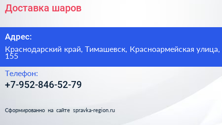 Доставка шаров по адресу Краснодарский край, Тимашевск, Красноармейская улица, 155 в дальнейшем Организация, размещена в следующих категориях: