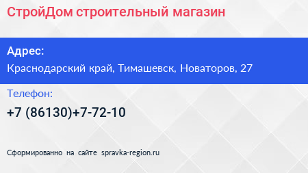 СтройДом, строительный магазин по адресу Краснодарский край, Тимашевск, Новаторов, 27 в дальнейшем Организация, размещена в следующих категориях: