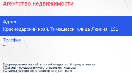 Агентство недвижимости по адресу Краснодарский край, Тимашевск, улица Ленина, 151 в дальнейшем Организация, размещена в следующих категориях: