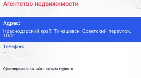 Агентство недвижимости по адресу Краснодарский край, Тимашевск, Советский переулок, 10/2 в дальнейшем Организация, размещена в следующих категориях:
