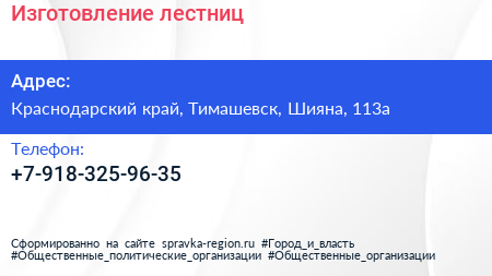 Изготовление лестниц по адресу Краснодарский край, Тимашевск, Шияна, 113а в дальнейшем Организация, размещена в следующих категориях:
