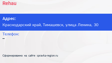 Rehau по адресу Краснодарский край, Тимашевск, улица Ленина, 30 в дальнейшем Организация, размещена в следующих категориях: