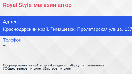 Royal Style, магазин штор по адресу Краснодарский край, Тимашевск, Пролетарская улица, 137 в дальнейшем Организация, размещена в следующих категориях: