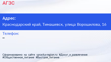 АГЗС по адресу Краснодарский край, Тимашевск, улица Ворошилова, 16 в дальнейшем Организация, размещена в следующих категориях: