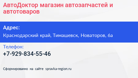 АвтоДоктор, магазин автозапчастей и автотоваров по адресу Краснодарский край, Тимашевск, Новаторов, 6а в дальнейшем Организация, размещена в следующих категориях: