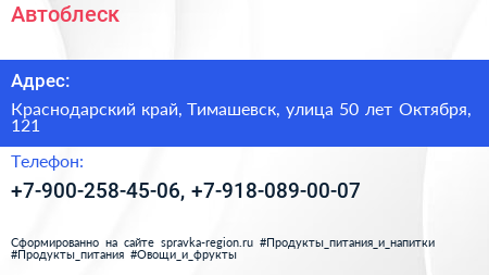 Автоблеск по адресу Краснодарский край, Тимашевск, улица 50 лет Октября, 121 в дальнейшем Организация, размещена в следующих категориях: