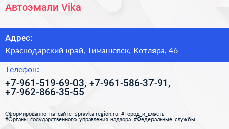 Автоэмали Vika по адресу Краснодарский край, Тимашевск, Котляра, 46 в дальнейшем Организация, размещена в следующих категориях: