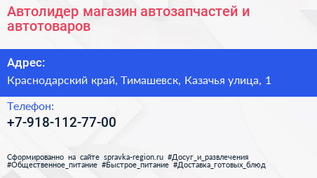 Автолидер, магазин автозапчастей и автотоваров по адресу Краснодарский край, Тимашевск, Казачья улица, 1 в дальнейшем Организация, размещена в следующих категориях: