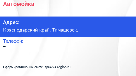 Автомойка по адресу Краснодарский край, Тимашевск, в дальнейшем Организация, размещена в следующих категориях: