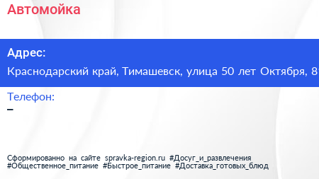 Автомойка по адресу Краснодарский край, Тимашевск, улица 50 лет Октября, 81 в дальнейшем Организация, размещена в следующих категориях: