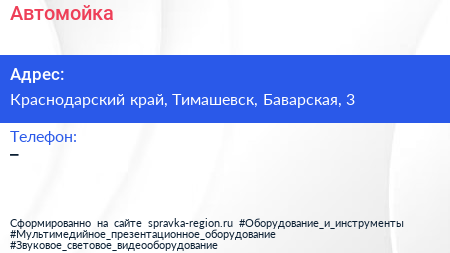Автомойка по адресу Краснодарский край, Тимашевск, Баварская, 3 в дальнейшем Организация, размещена в следующих категориях: