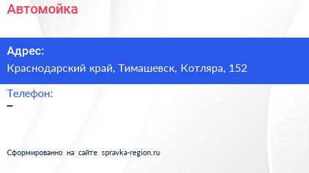 Автомойка по адресу Краснодарский край, Тимашевск, Котляра, 152 в дальнейшем Организация, размещена в следующих категориях: