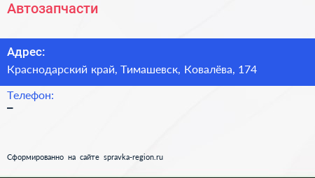 Автозапчасти по адресу Краснодарский край, Тимашевск, Ковалёва, 174 в дальнейшем Организация, размещена в следующих категориях: