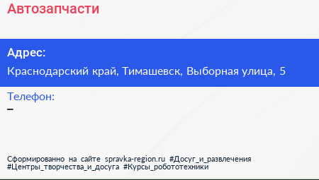 Автозапчасти по адресу Краснодарский край, Тимашевск, Выборная улица, 5 в дальнейшем Организация, размещена в следующих категориях: