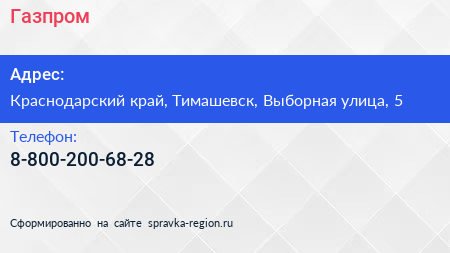 Газпром по адресу Краснодарский край, Тимашевск, Выборная улица, 5 в дальнейшем Организация, размещена в следующих категориях: