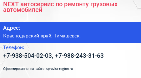 NEXT, автосервис по ремонту грузовых автомобилей по адресу Краснодарский край, Тимашевск, в дальнейшем Организация, размещена в следующих категориях: