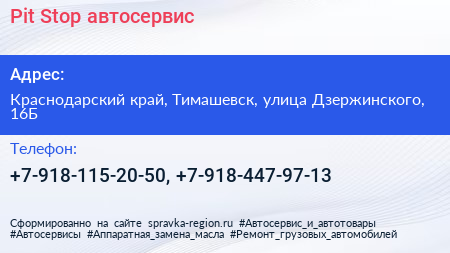 Pit-Stop, автосервис по адресу Краснодарский край, Тимашевск, улица Дзержинского, 16Б в дальнейшем Организация, размещена в следующих категориях: