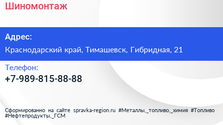 Шиномонтаж по адресу Краснодарский край, Тимашевск, Гибридная, 21 в дальнейшем Организация, размещена в следующих категориях: