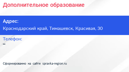 Дополнительное образование по адресу Краснодарский край, Тимашевск, Красивая, 30 в дальнейшем Организация, размещена в следующих категориях: