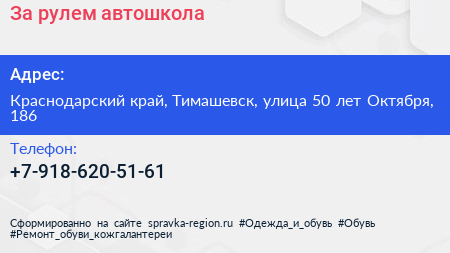 За рулем, автошкола по адресу Краснодарский край, Тимашевск, улица 50 лет Октября, 186 в дальнейшем Организация, размещена в следующих категориях:
