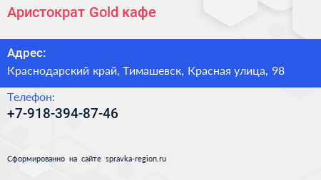 Аристократ-Gold, кафе по адресу Краснодарский край, Тимашевск, Красная улица, 98 в дальнейшем Организация, размещена в следующих категориях: