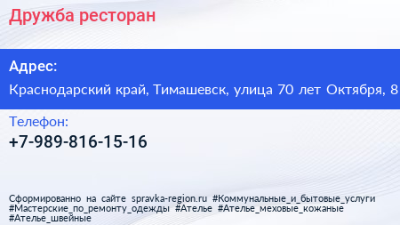 Дружба, ресторан по адресу Краснодарский край, Тимашевск, улица 70 лет Октября, 8 в дальнейшем Организация, размещена в следующих категориях: