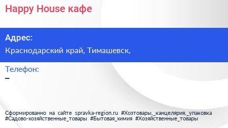 Happy House, кафе по адресу Краснодарский край, Тимашевск, в дальнейшем Организация, размещена в следующих категориях:
