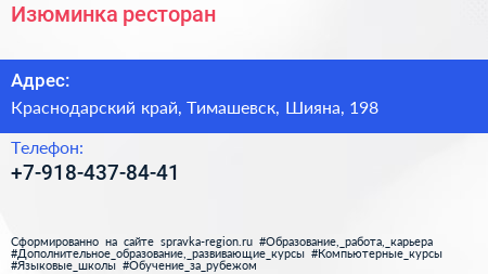 Изюминка, ресторан по адресу Краснодарский край, Тимашевск, Шияна, 198 в дальнейшем Организация, размещена в следующих категориях: