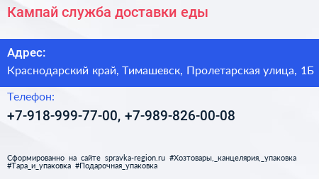 Кампай, служба доставки еды по адресу Краснодарский край, Тимашевск, Пролетарская улица, 1Б в дальнейшем Организация, размещена в следующих категориях: