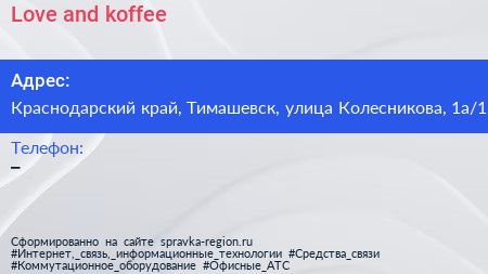 Love and koffee по адресу Краснодарский край, Тимашевск, улица Колесникова, 1а/1 в дальнейшем Организация, размещена в следующих категориях: