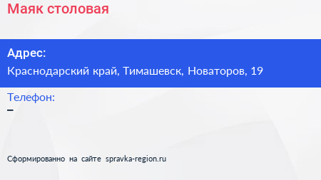 Маяк, столовая по адресу Краснодарский край, Тимашевск, Новаторов, 19 в дальнейшем Организация, размещена в следующих категориях: