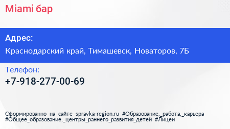 Miami, бар по адресу Краснодарский край, Тимашевск, Новаторов, 7Б в дальнейшем Организация, размещена в следующих категориях: