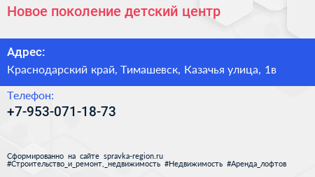 Новое поколение, детский центр по адресу Краснодарский край, Тимашевск, Казачья улица, 1в в дальнейшем Организация, размещена в следующих категориях: